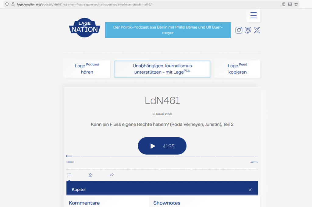Der reichweitenstarke Podcast Lage der Nation widmet sich ausführlich der Frage, ob Flüsse eigene Rechte haben können, und diskutiert mit der Klimajuristin Roda Verheyen die rechtlichen und demokratischen Konsequenzen. Die Folge ordnet die Idee der Rechte der Spree in einen größeren verfassungs- und umweltrechtlichen Kontext ein und macht deutlich, warum ein Perspektivwechsel im Naturschutz überfällig ist.