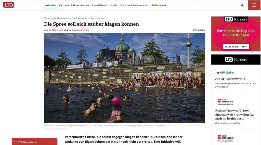 LTO, das führende juristische Online-Magazin in Deutschland, hat über die Initiative Rechte der Spree berichtet und den Gesetzentwurf juristisch eingeordnet. Der Beitrag zeigt auf, wie die Anerkennung eigener Rechte für die Spree bestehende Defizite des Umweltrechts adressieren und staatliche Verantwortung verbindlicher machen könnte.