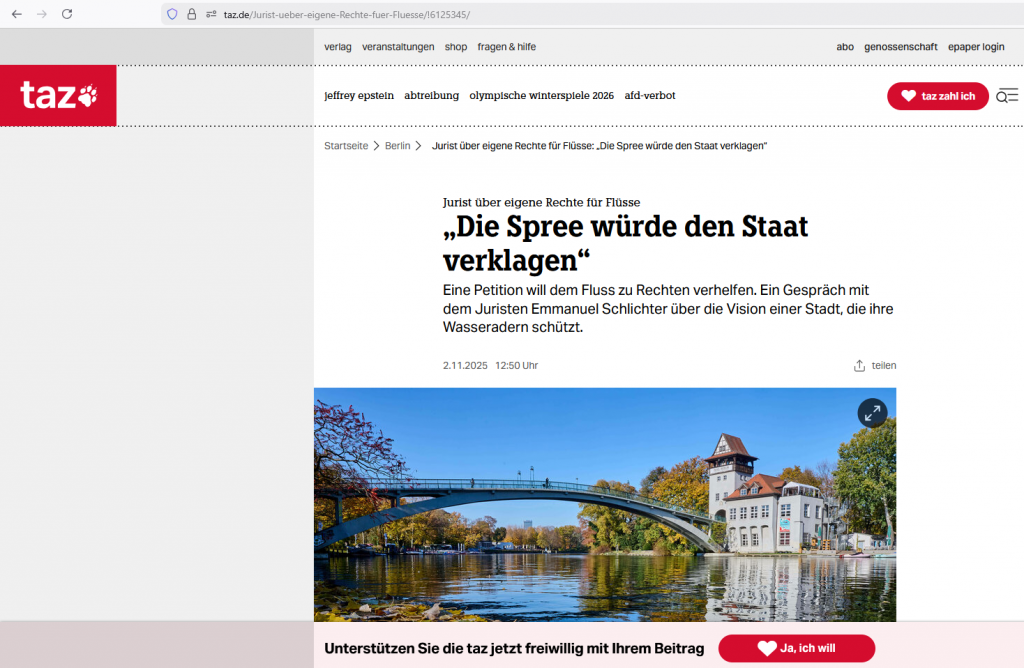 Die taz greift die Initiative Rechte der Spree auf und lässt einen der beteiligten Juristen erklären, wie Flüsse als Rechtssubjekte ihre Interessen künftig selbst durchsetzen könnten. Der Artikel macht deutlich, warum eigene Rechte für Flüsse kein radikaler Bruch, sondern eine konsequente Weiterentwicklung des Umweltrechts sind.